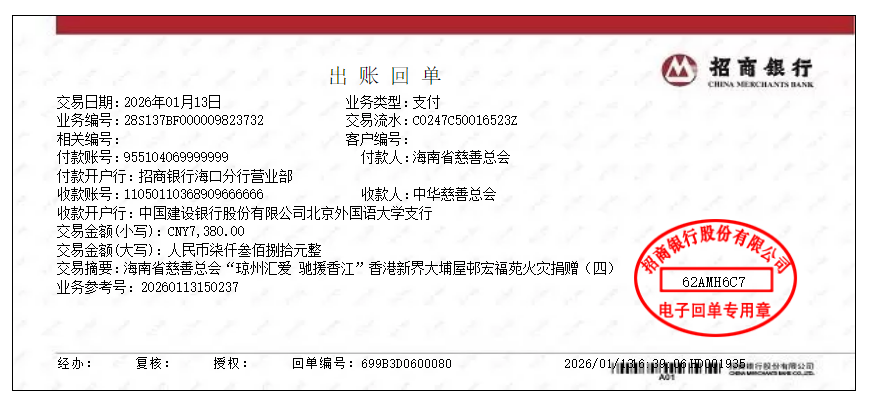 一、2025年12月30日24时至2026年1月13日24时,通过海南省慈善总会银行账户接收的转账共计7,380.00元。该笔款项系于2025年12月19日到账,附言备注为“捐款”;捐赠人已于2026年1月5日补充提交捐赠意向书,明确指定该笔捐款用于香港大埔火灾援助。捐赠具体明细予以公示:(请查看附件)