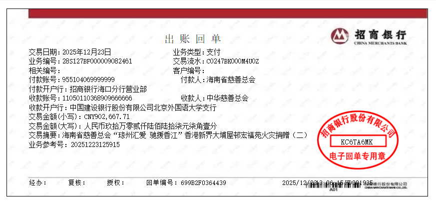 三、2025年12月18日24时至2025年12月23日24时,海南省慈善总会拨付至中华慈善总会902,667.71元。捐赠具体明细予以公示:(请查看附件)